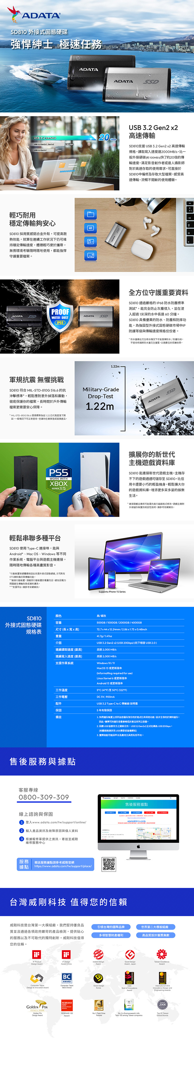 1. 支援 USB 3.2 Gen2 x2 高速傳輸 2. 2000MB/s 高速讀寫傳輸 3. IP68 強悍防水、防塵與防摔 4. 支援新世代主機遊戲 5. 支援多種作業系統與電腦平台