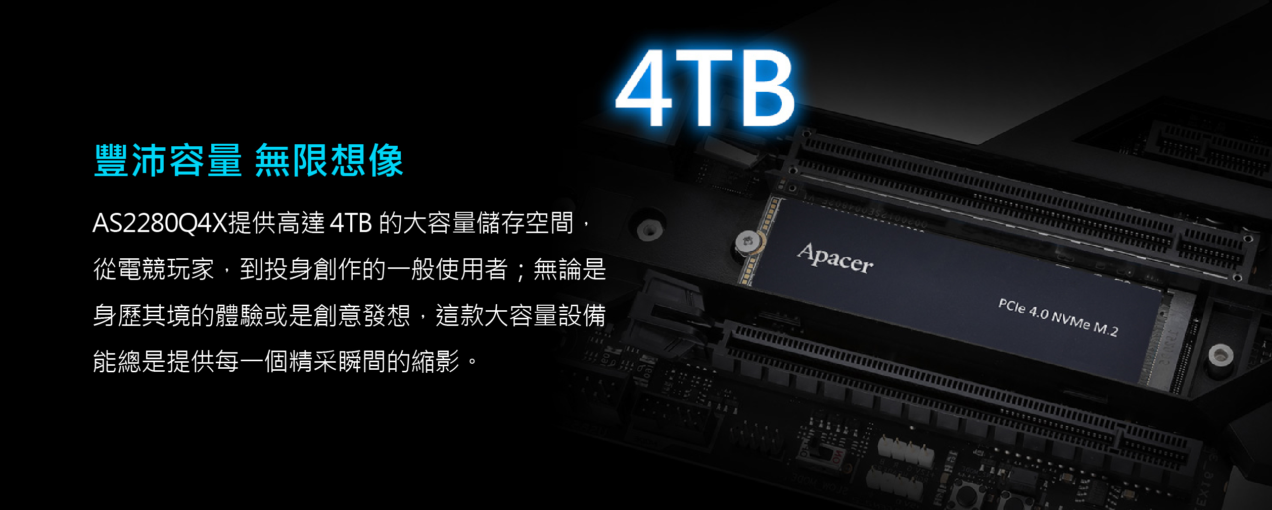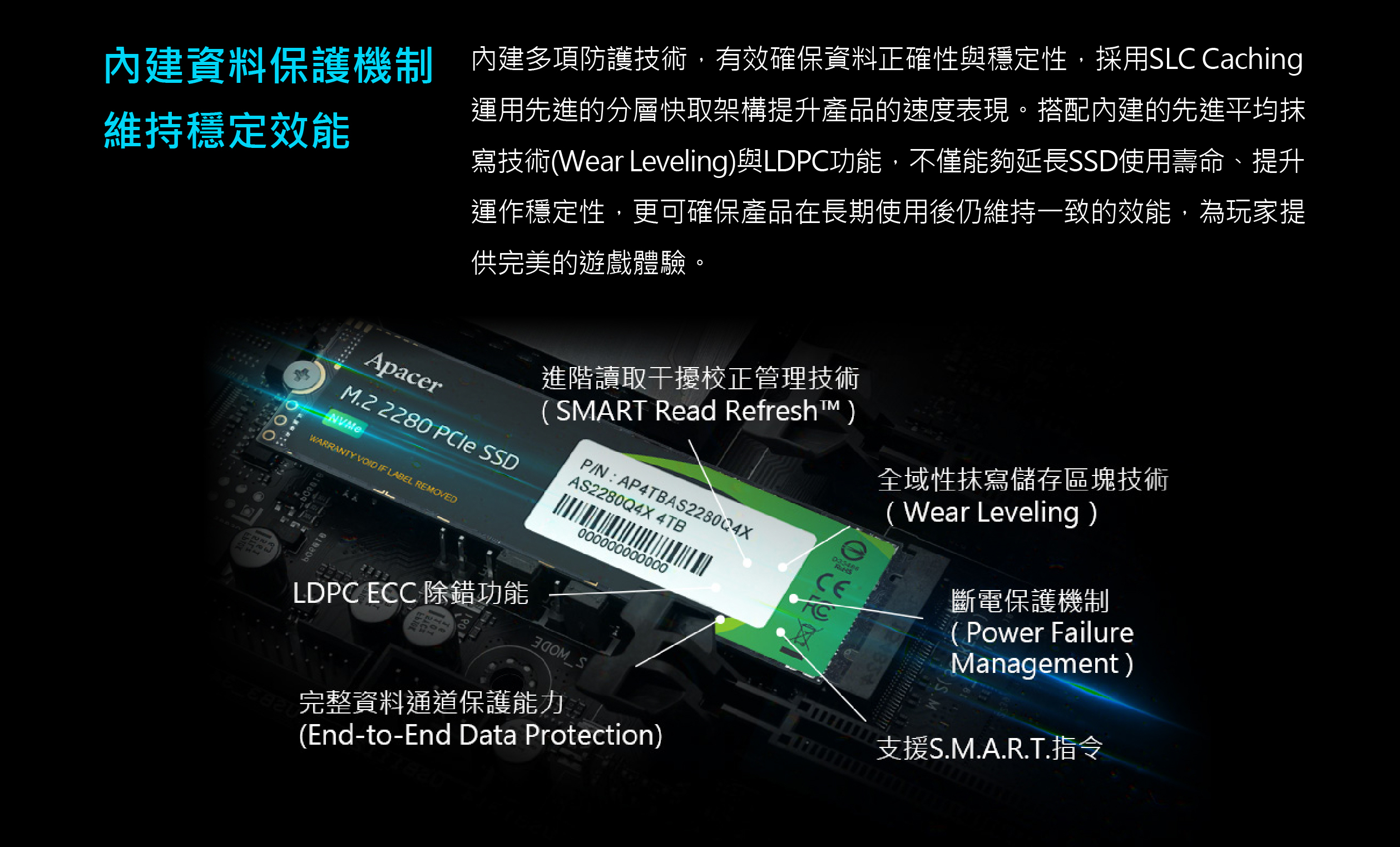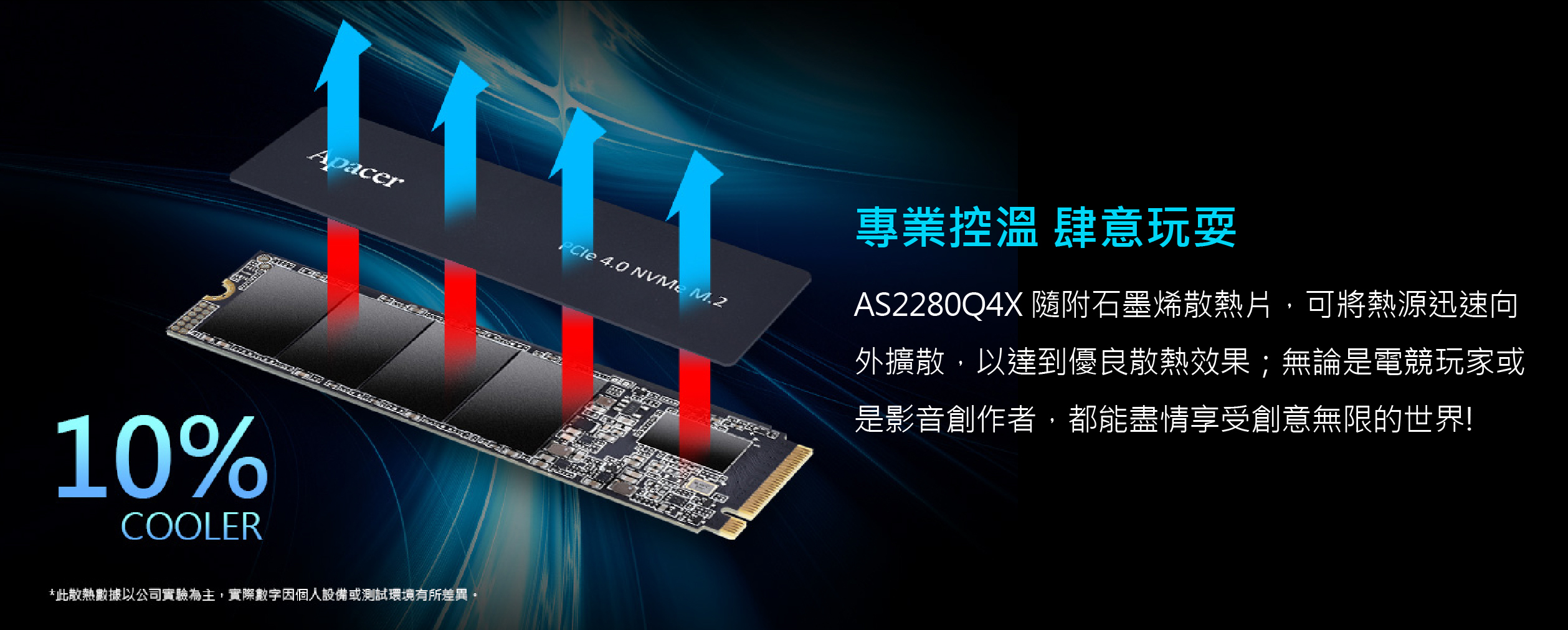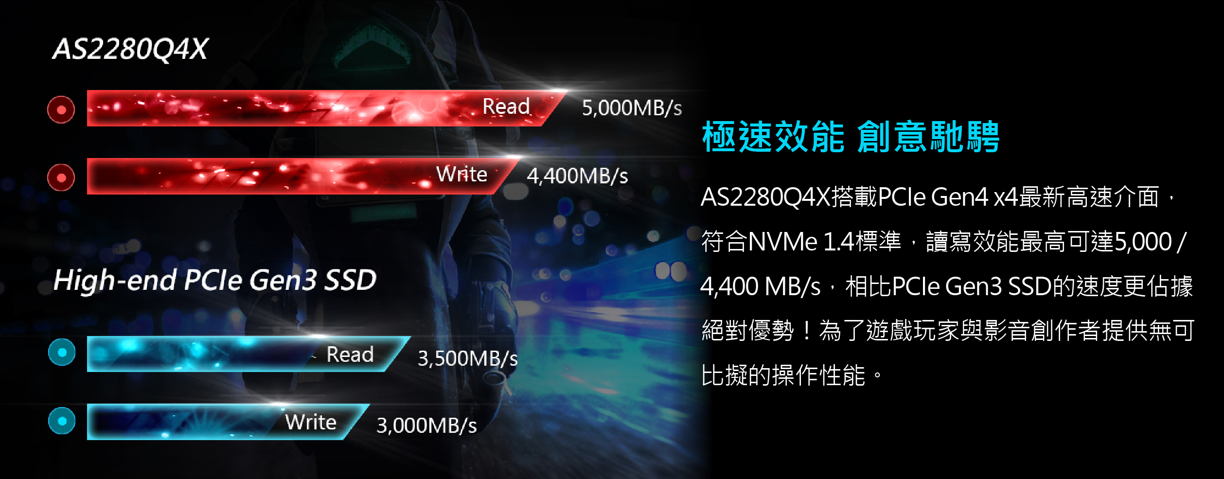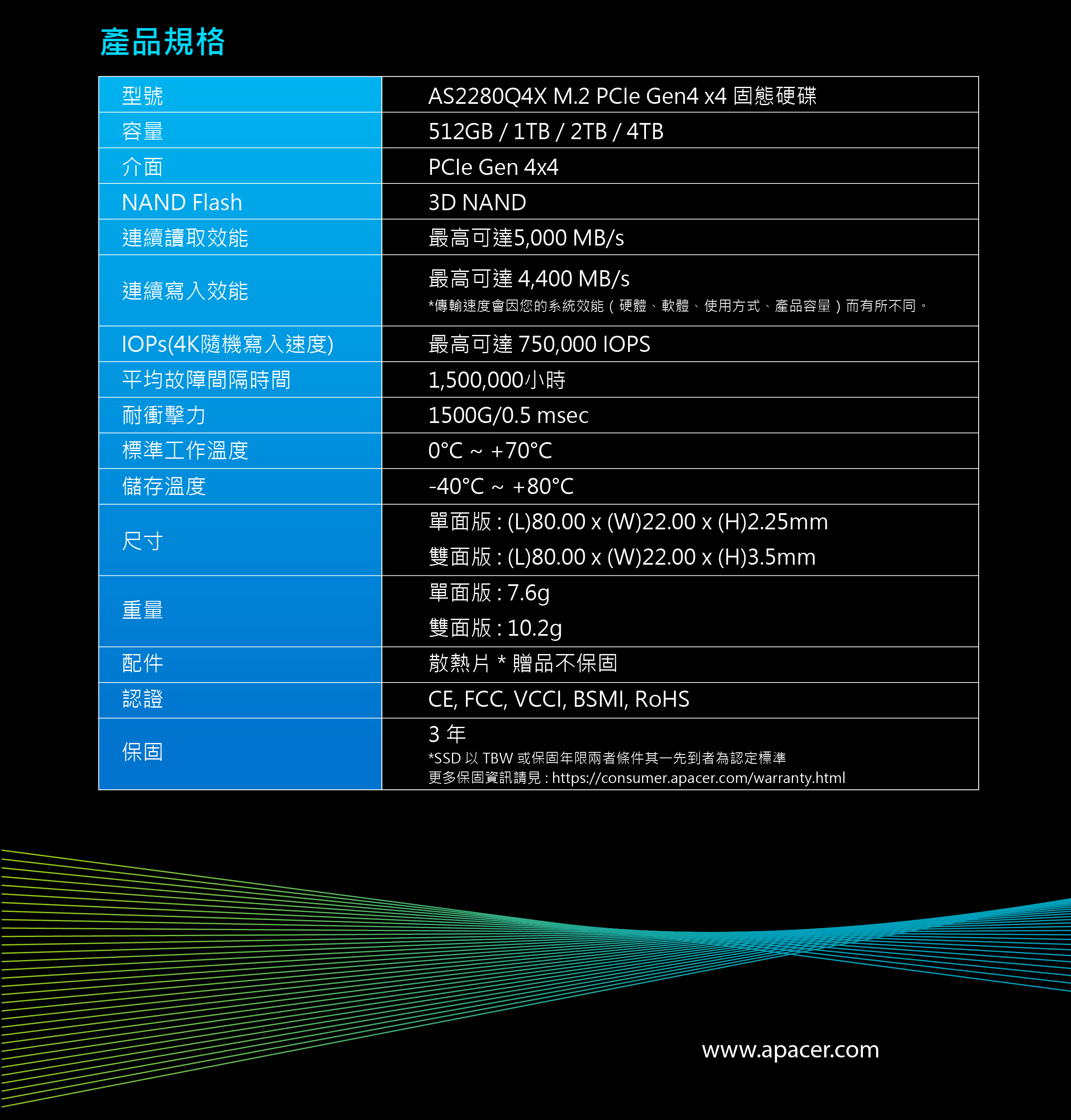 *搭載 PCIe Gen4x4 最新高速介面,符合 NVMe 1.4 標準。 *讀寫效能最高可達 5000/4400 MB/s *隨附石墨烯散熱片,將熱源迅速向外擴散,有效降溫10%。 *高達4TB大容量儲存空間。 *內建多項防護技術,確保讀寫正確與穩定,3年全球保固。