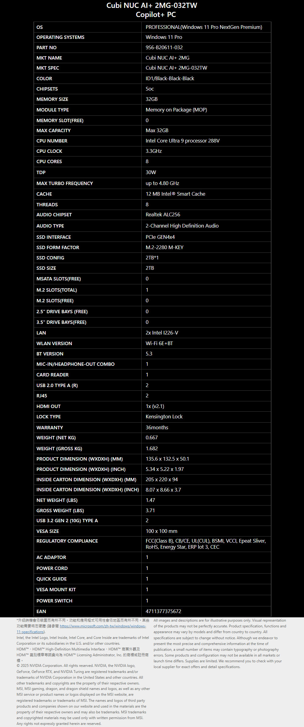 微星MSI Cubi NUC AI+ 2MG-032TW-B9288V32GS2TX11PNGPA(迷你電腦)(L10)