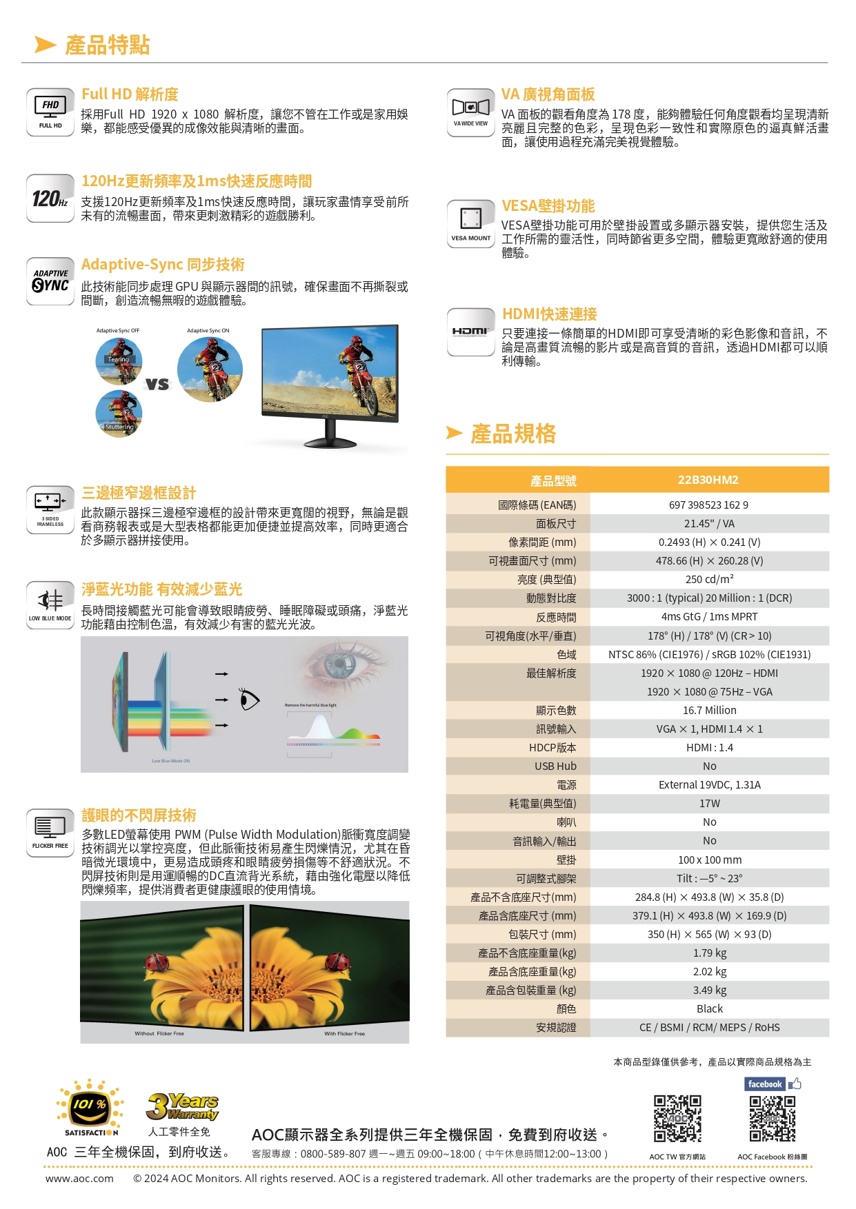 21.45吋/1920×1080@120Hz‒HDMI/VA/VGA*1/HDMI*1/1ms MPRT/250cd/m²