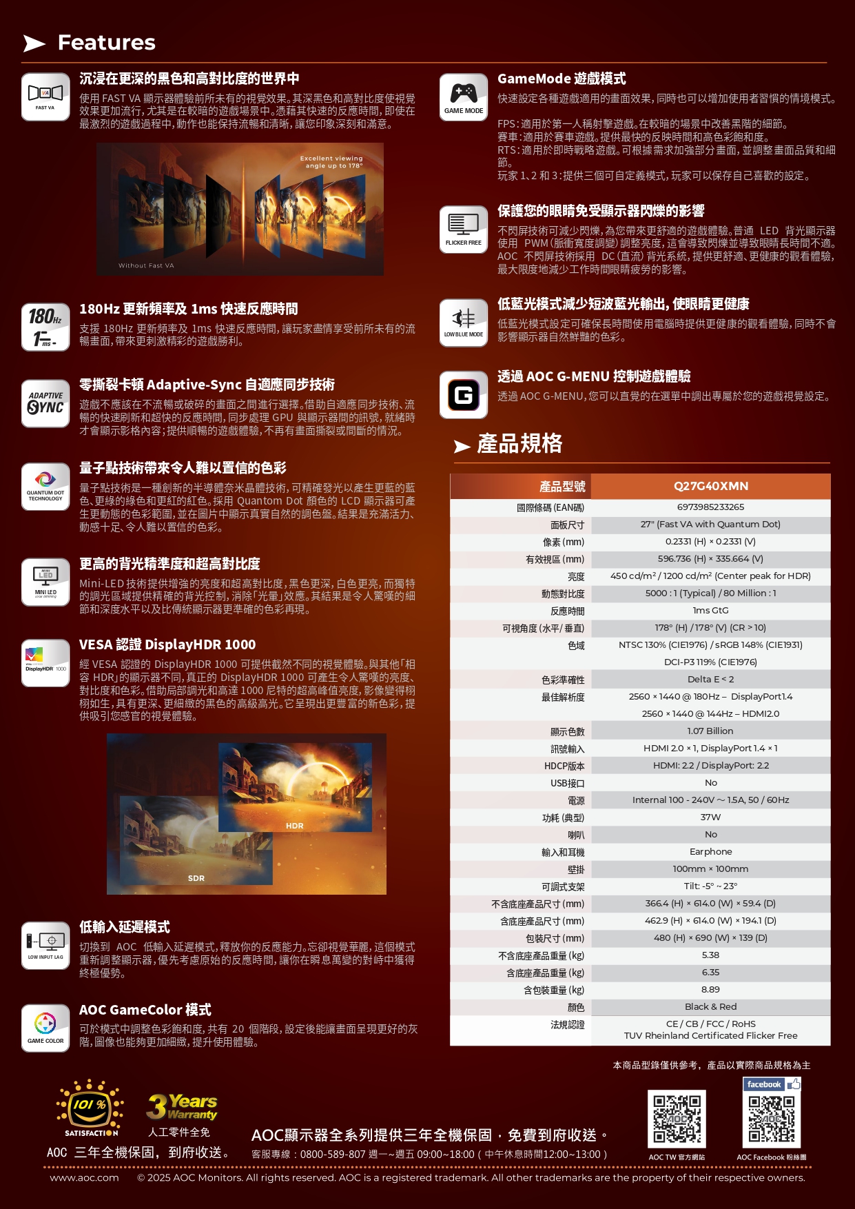 27吋/Fast VA/2560×1440@180Hz/1ms GtG/178度/HDMI*1/DP*1