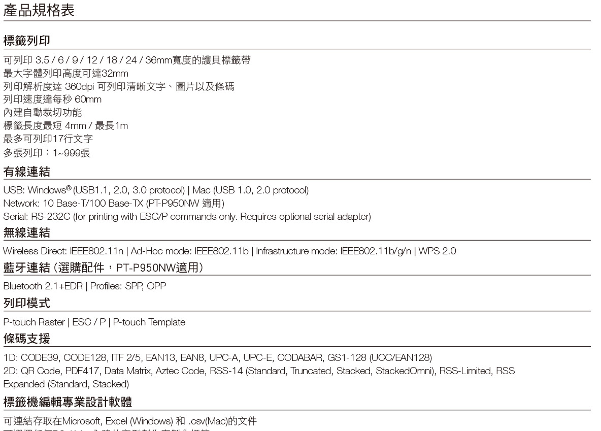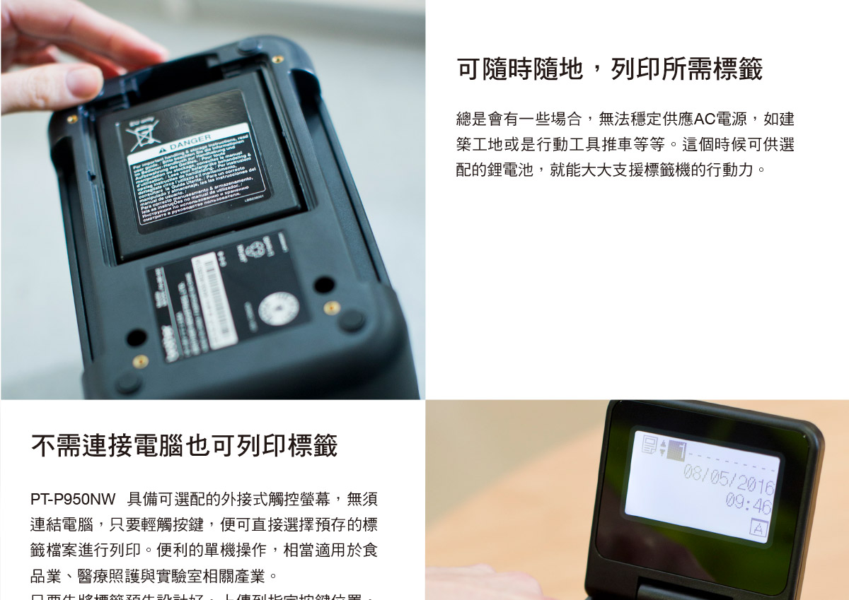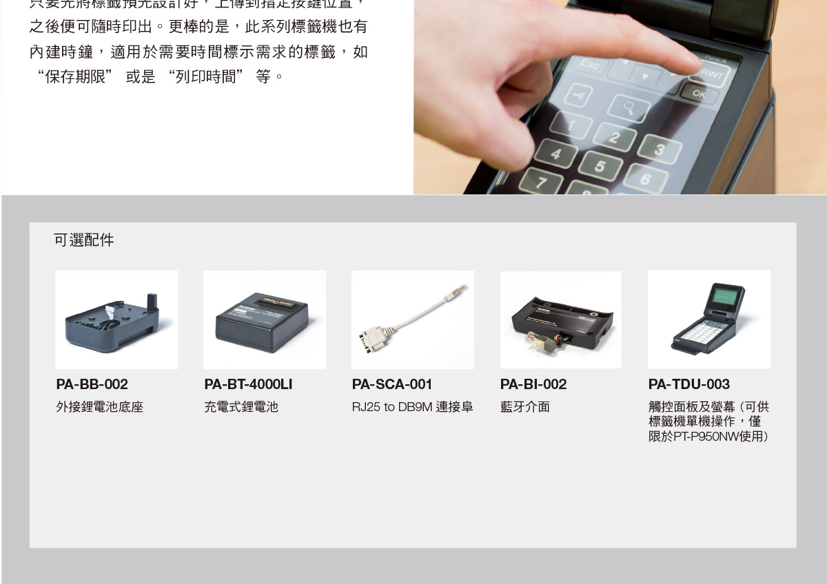 適用: TZE 護貝 3~36mm/HSE 熱縮套管 5.2~31mm/FLE 定型旗幟 選配:可充電鋰離子電池 (PA-BT-4000Li) 底座 (PA-BB-002)