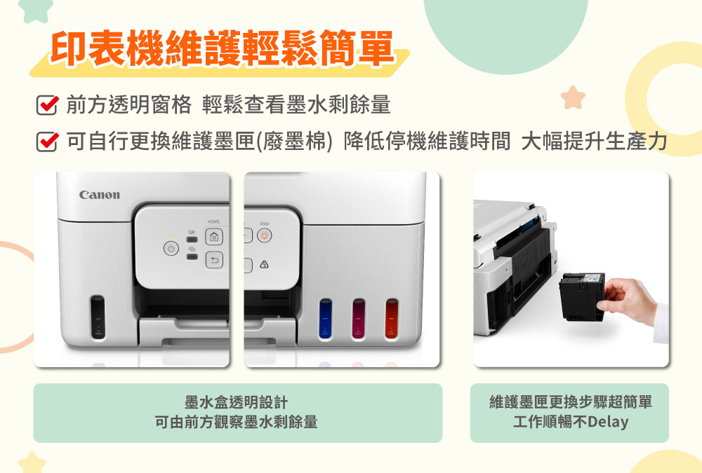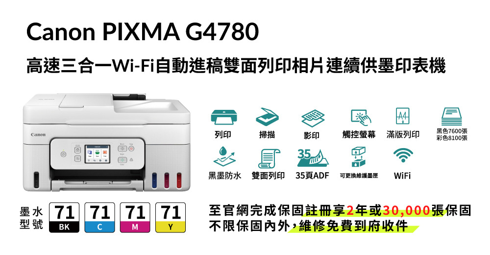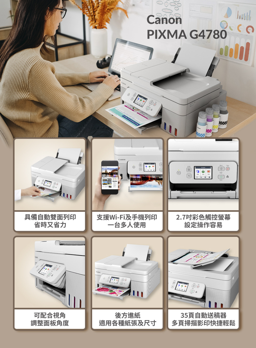 Canon PIXMA G4780三合一Wi-Fi自動進稿雙面列印相片連續供墨印表機,提供黑白文件7,600頁*,彩色文件8,100頁*超大印量,文件列印品質清晰銳利,細小文字也能輕鬆好讀,且支援最大A4滿版相片列印。G4780具備自動雙面列印功能,也支援多種的紙張類型和尺寸大小,自訂尺寸最長可達1,200 mm,提供使用者廣泛的應用。另外也配備自動送稿器,讓掃描或影印多頁原稿文件時更加省力省時,G4780也提高印表機維護的方便性,可由使用者自行更換維護墨匣(廢墨棉),將維護停機時間降至最低,以實現最高的生產力。