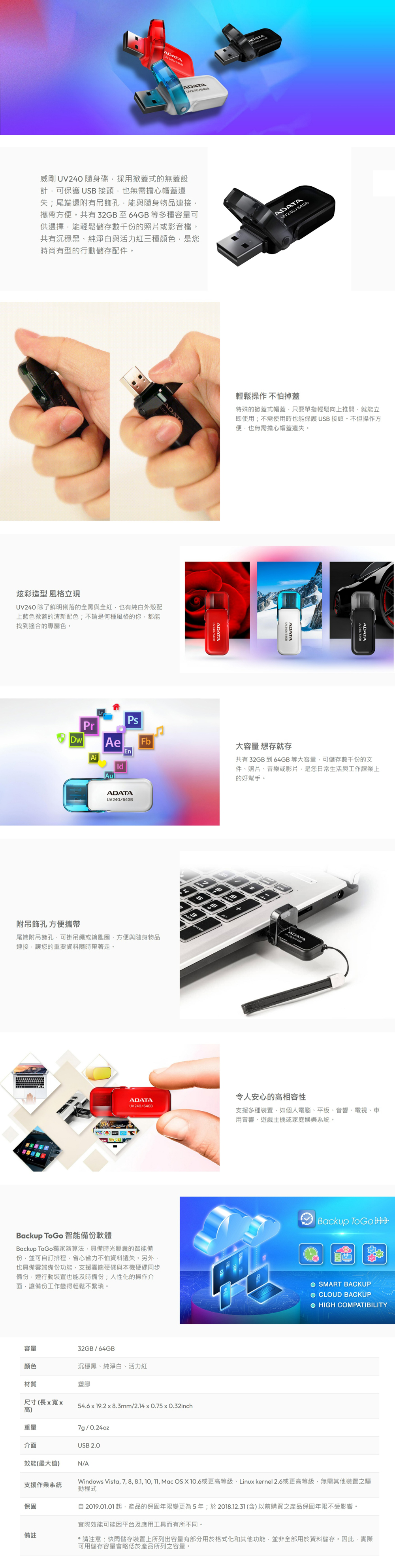 ● 介面:USB 2.0 ● 令人安心的高相容性,支援多種裝置 ● 炫彩造型 風格立現 ● 採用掀蓋式的無蓋設計 ● 尾端附吊飾孔,可掛吊繩或鑰匙圈