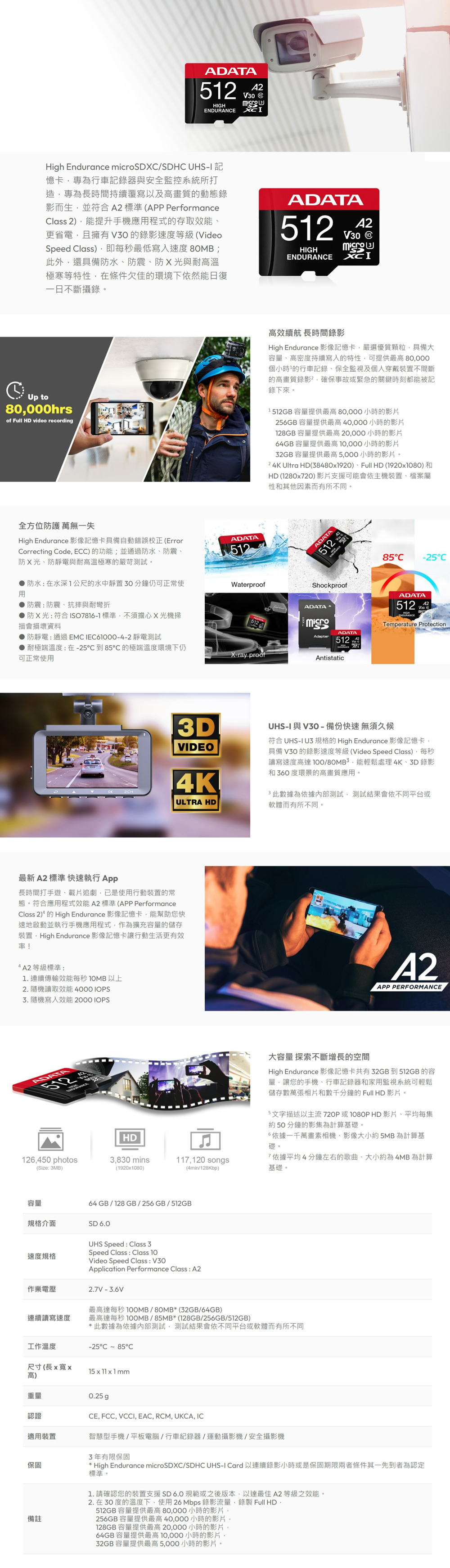 ● 規格介面:SD 6.0 ● 每秒讀寫速度高達 100/80MB ● 專為行車記錄器與安全監控系統所打造 ● 高效續航 長時間錄影 ● 具備自動錯誤校正功能;防水、防震、防 X 光、防靜電與耐高溫極寒