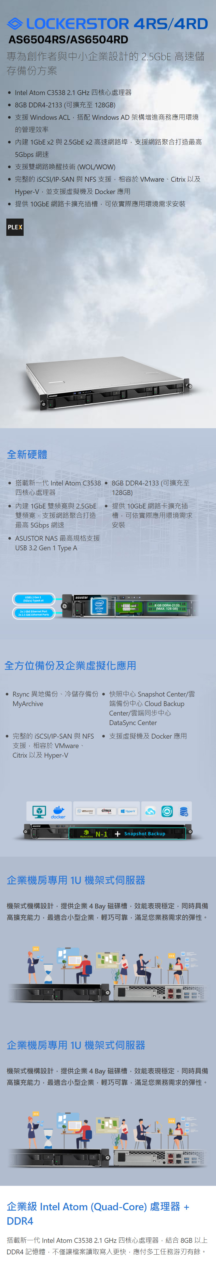 | Intel Atom C3538 2.1 GHz 四核心處理器 8GB DDR4-2133 (可擴充至 128GB) 支援 Windows ACL,搭配 Windows AD 架構增進商務應用環境的管理效率 內建 1GbE x2 與 2.5GbE x2 高速網路埠,支援網路聚合打造最高 5Gbps 網速