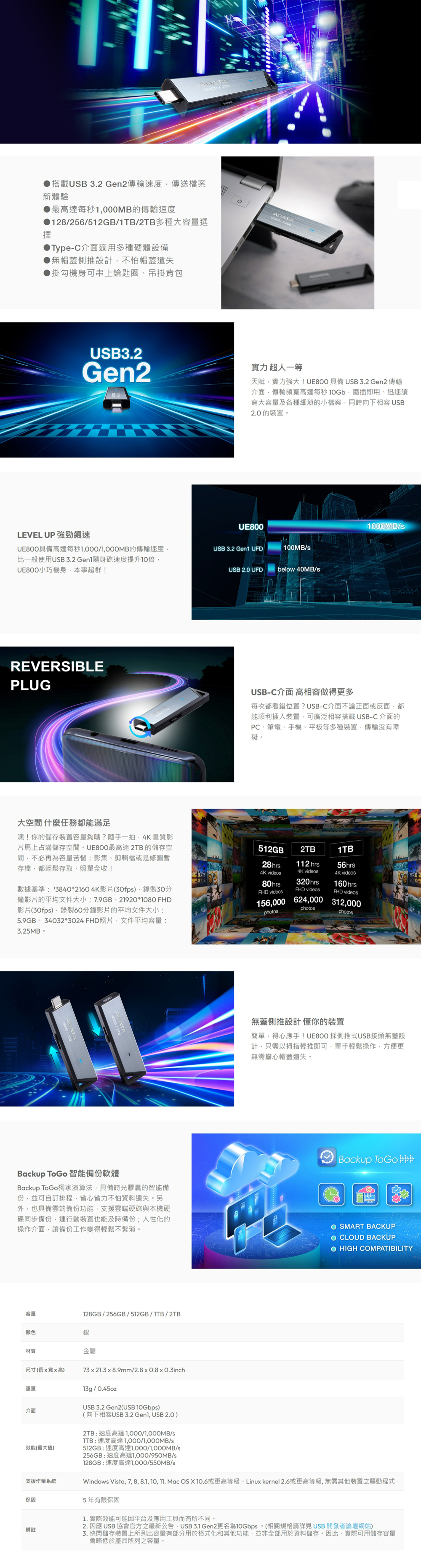 ● 搭載USB 3.2 Gen2傳輸速度 ● 最高達每秒1,000MB的傳輸速度 ● Type-C介面適用多種硬體設備 ● 無帽蓋側推設計,不怕帽蓋遺失 ● 掛勾機身可串上鑰匙圈、吊掛背包