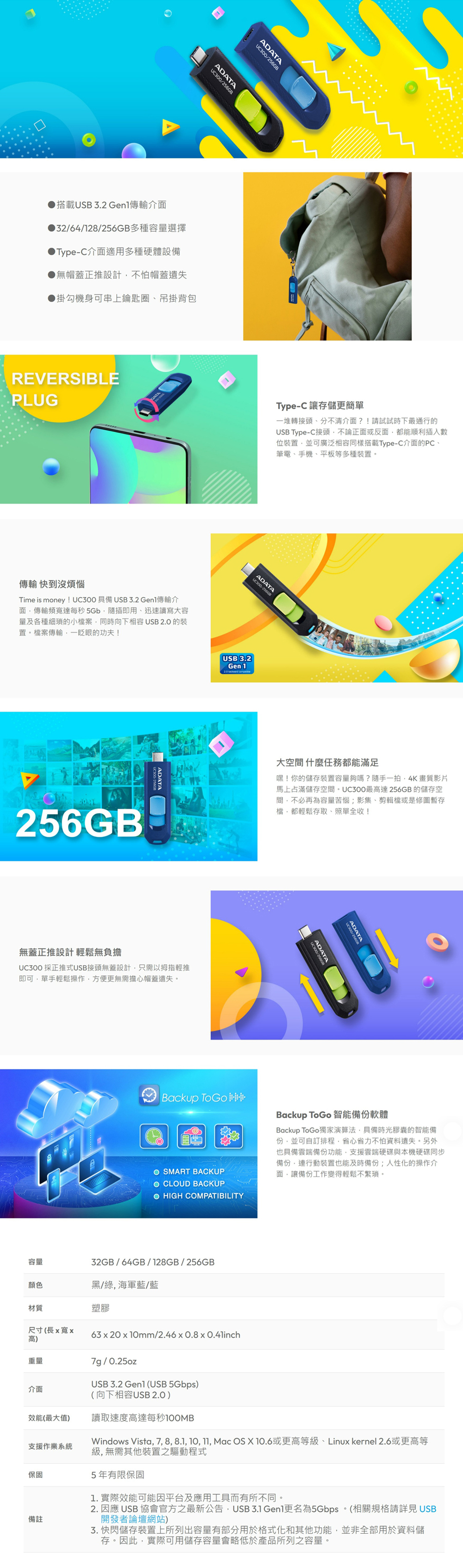 ● 搭載USB 3.2 Gen1傳輸介面 ● 讀取速度高達每秒100MB ● Type-C介面 適用多種硬體設備 ● 無帽蓋正推設計,不怕帽蓋遺失 ● 掛勾機身可串上鑰匙圈、吊掛背包