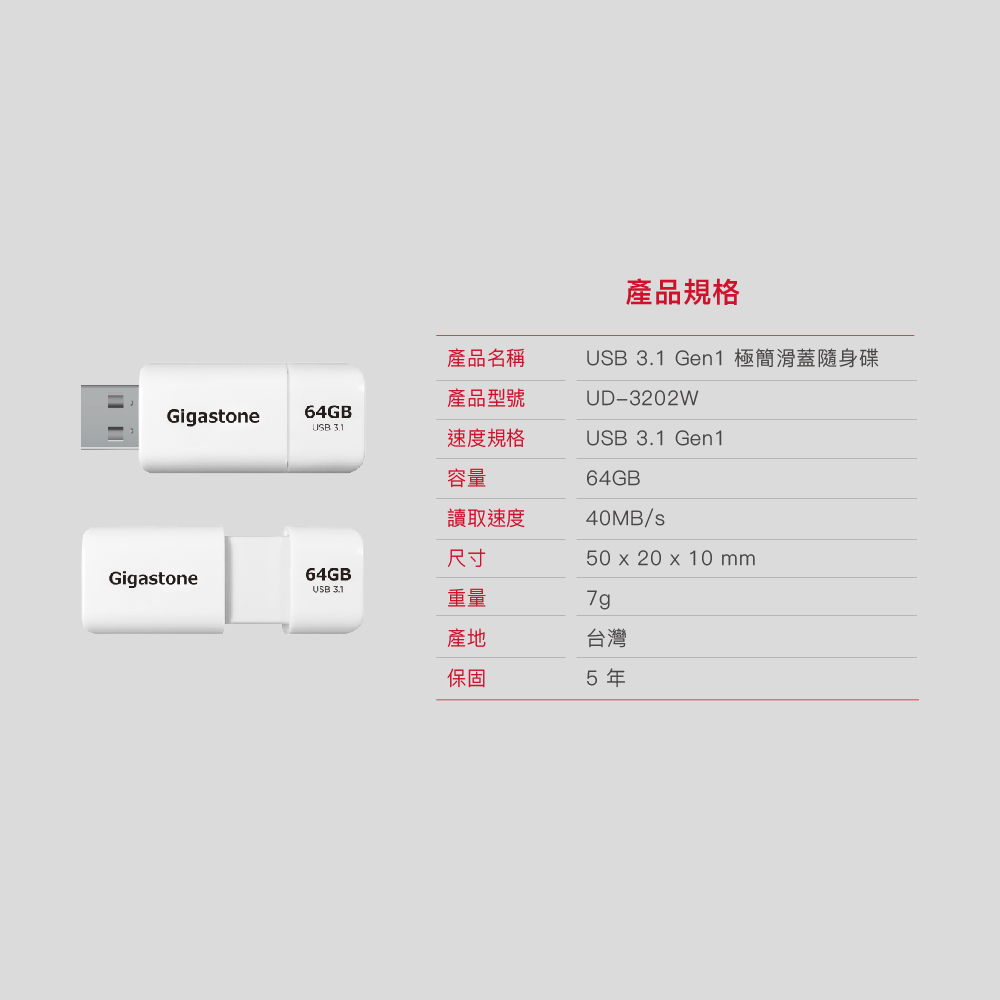 商品名稱: 極簡滑蓋隨身碟(天使白) 商品型號: UD-3202W 商品容量: 64GB 讀/寫速度: 40MB/s讀取、15MB/s寫入 傳輸速率: USB3.1高速接口(為USB2.0的十倍) 重量: 7g 尺寸: 50x20x10mm 保固年限: 五年