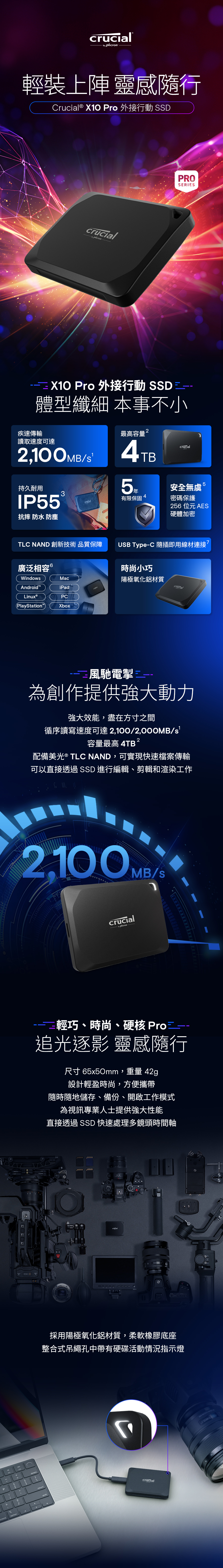 ●讀取速度可達2,100 MB / s ●IP55 防水、防塵、防沙 ●與多種裝置相容 ●隨插即用 ●USB Type - C ●密碼保護、256位AES、硬體加密