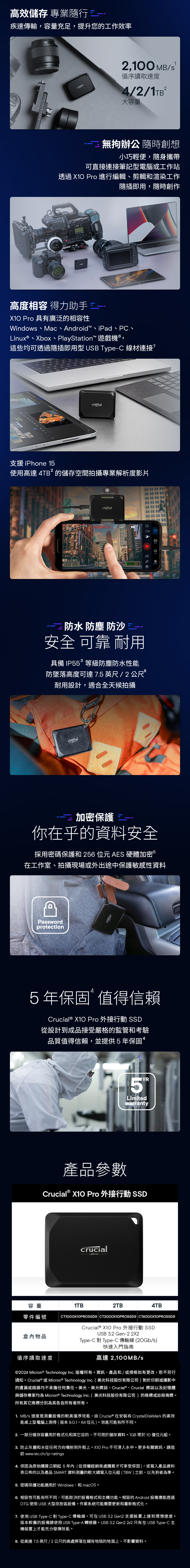●讀取速度可達2,100 MB / s ●IP55 防水、防塵、防沙 ●與多種裝置相容 ●隨插即用 ●USB Type - C ●密碼保護、256位AES、硬體加密