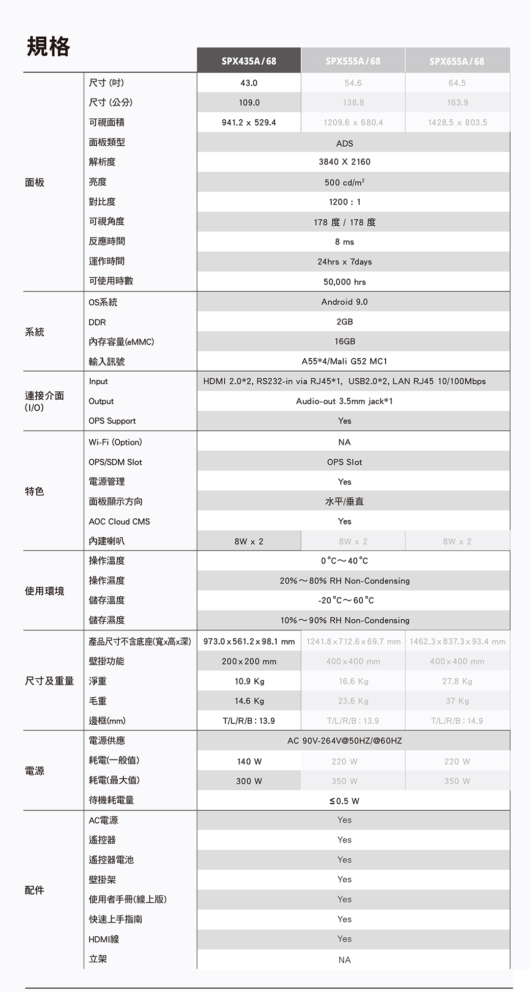 ● ADS 廣視角面板 ● 配備4K UHD (3840 x 2160) ● 自由切換垂直/水平顯示 ● 專為24/7連續顯示設計 ● 採用安卓作業系統及AOC CMS 內容管理軟體