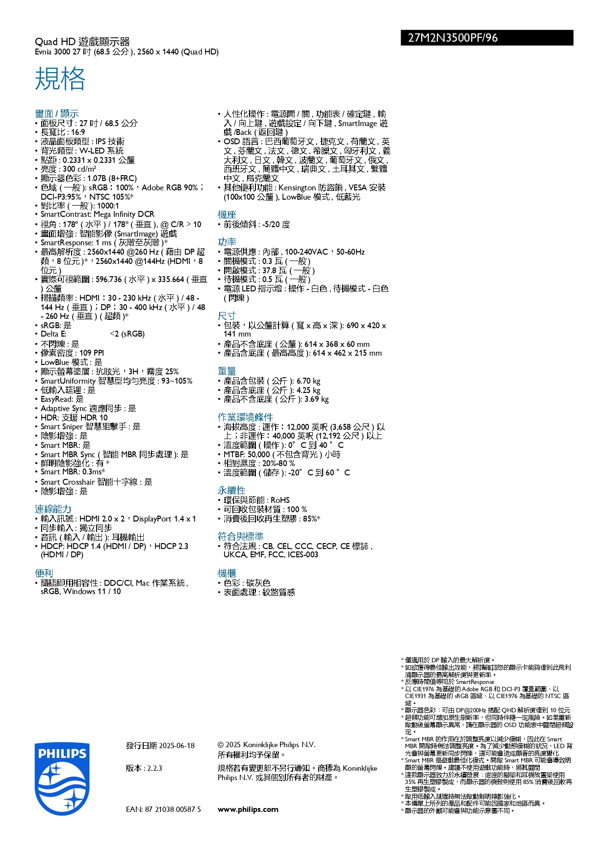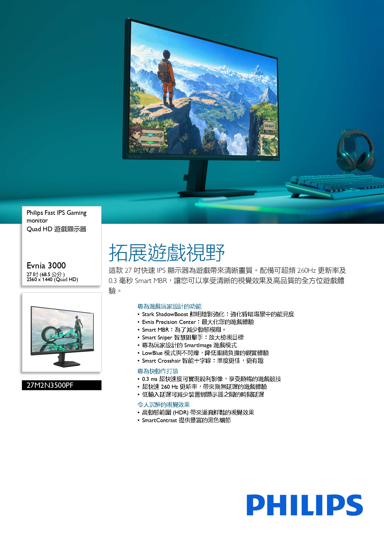27吋/IPS/2560x1440@260Hz/Smart MBR: 0.3ms/HDMI*2/DP*1